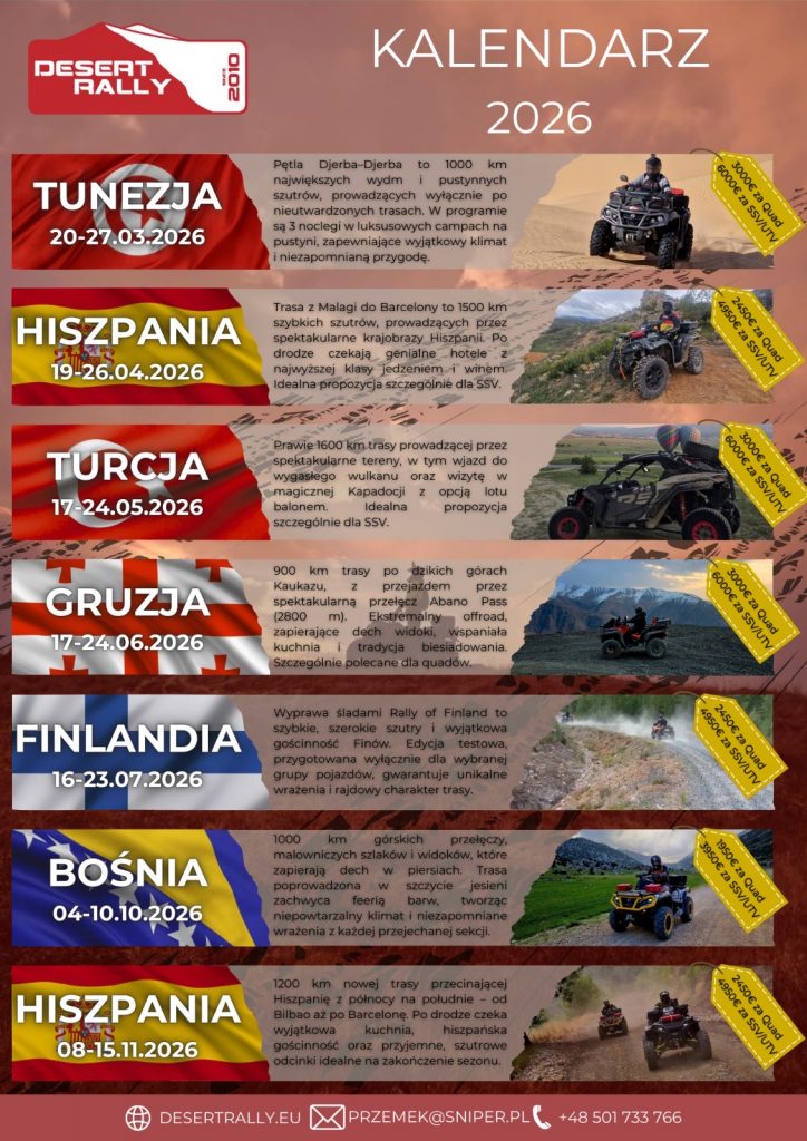 Jeśli jednak bliższe są Ci cztery koła niż dwa, możesz dołączyć do naszych rajdów. Masz własnego quada lub UTV i masz już dość polskich bezdroży oraz ciągłych ograniczeń? Przygotowaliśmy wyprawy m.in. do Turcji, Hiszpanii, Gruzji, Bośni czy Finlandii – a to dopiero początek.